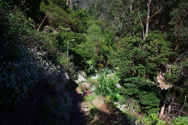 Minawszy tunel, dochodzimy do lewady - Levada dos Tornos. W punkcie szczytowym (około 600 m.n.p.m) znajduje siępokażnej wysokości wodospad. Od tego miejsca właściwie idziemy już po płaskim terenie, ale uwaga.... jest bardzo stromo, a momentami niebezpiecznie, gdyż jest wąsko i brakuje ubezpieczeń. Brak w tym logiki, gdyż lewady, które nie stwarzały większego niebezpieczeństwa, były bardzo dobrze ubezpieczone, a tutaj jakby zapomniano o konieczności ubezpieczeń. Lewada jest naprawdę wspaniała - wyjątkowa i... bardzo cicha. Spotkaliśmy na tej trasie niewielu turystów. Trudno stwierdzić, czy dlatego, że szlak raczej zarośnięty i bez mapy trudno go dostrzec, czy dlatego, że turystom nie chciało się dreptać pod górę i wybrali przejażdżkę kolejką linową do ogrodu botanicznego... Ze szlaku obserwujemy panoramę na Funchal i bezkresny ocean. Warto się tutaj wybrać i zobaczyć, jakie doznania estetyczne gwarantuje to miejsce. A jeśli komuś będzie zbyt wąsko i stromo - mamy propozycję, zawsze można wskoczyć do lewady, a woda zimnaaaa....
